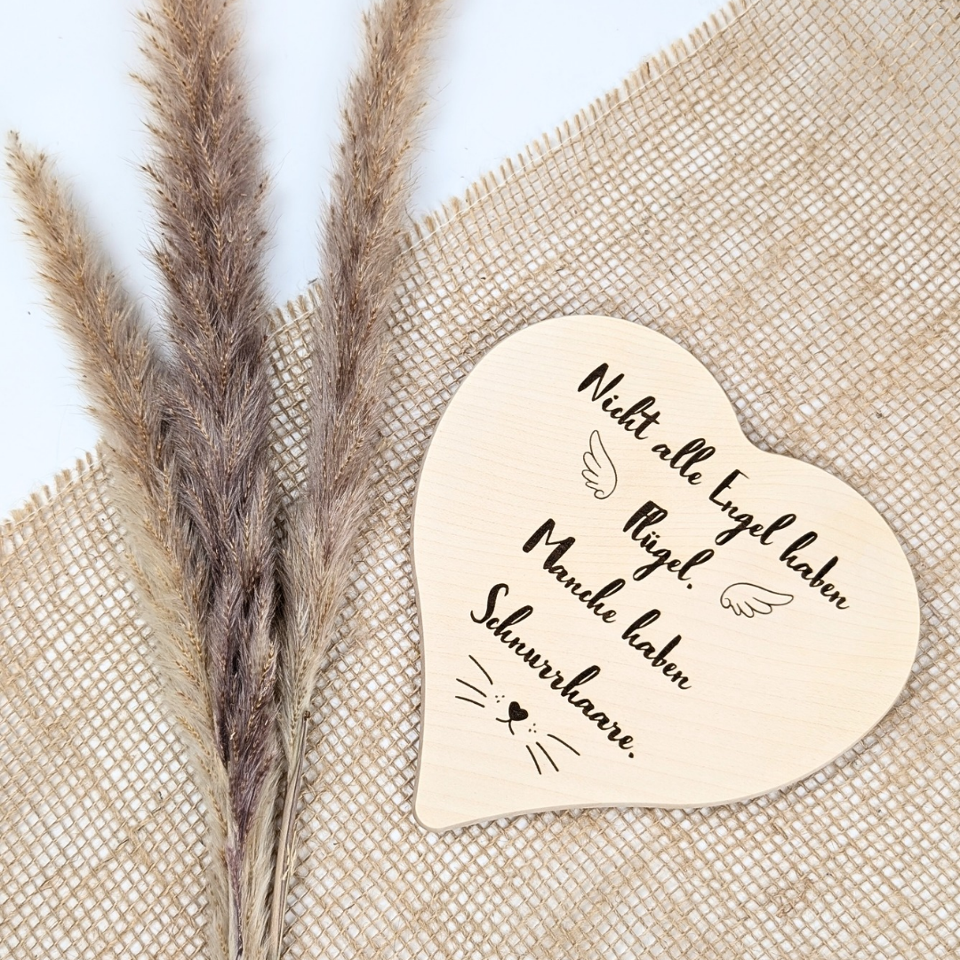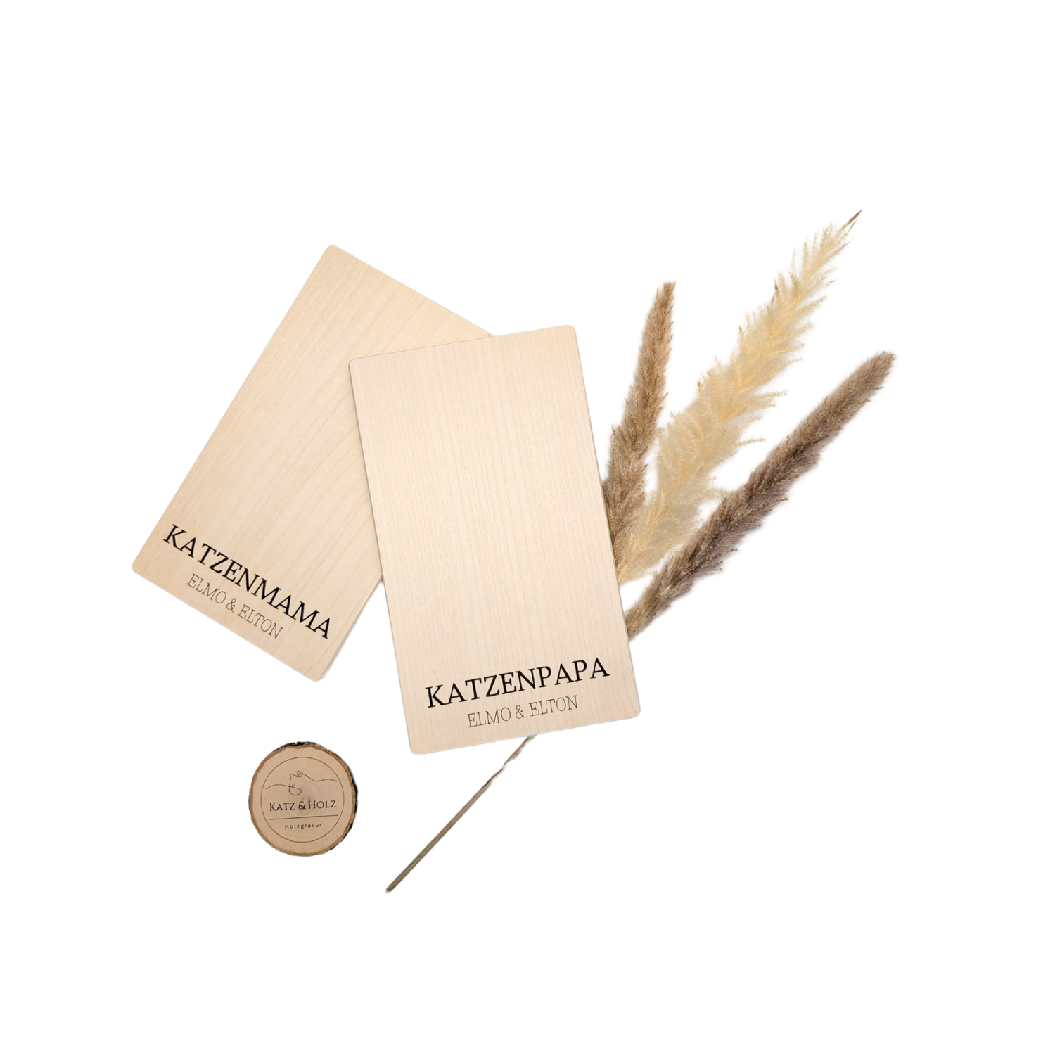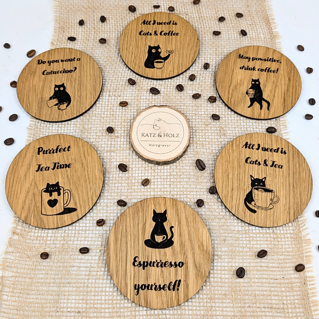 aus FSC-zertifiziertem Eichenholz mit schwarzer Filzunterseite und lustigen Katzensprüchen.